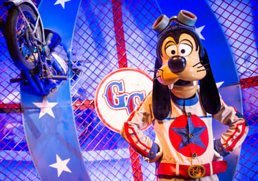Alza vuelo sobre Storybook Circus con Goofy en un avión de acrobacias y vive un emocionante paseo en una montaña rusa para niños.